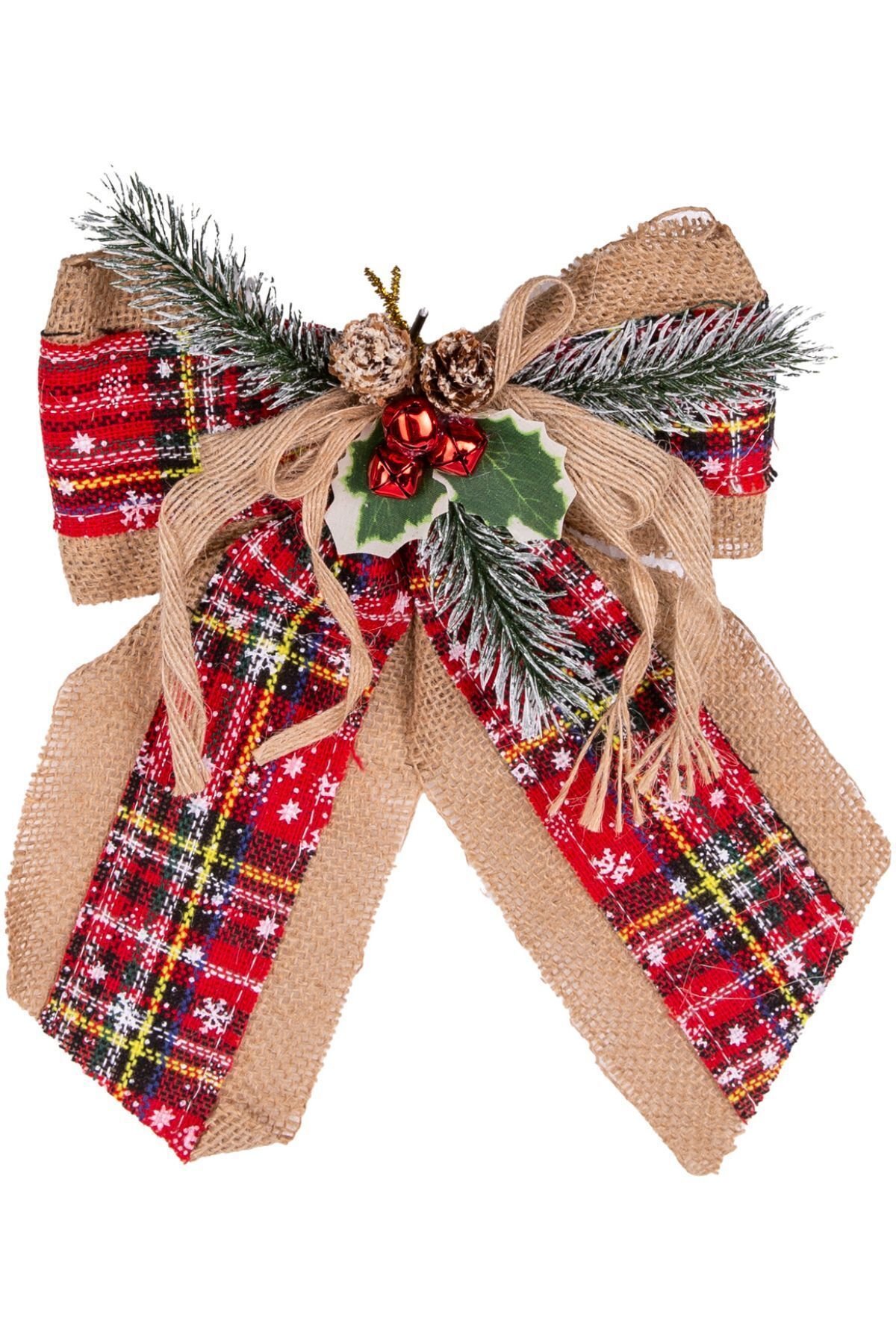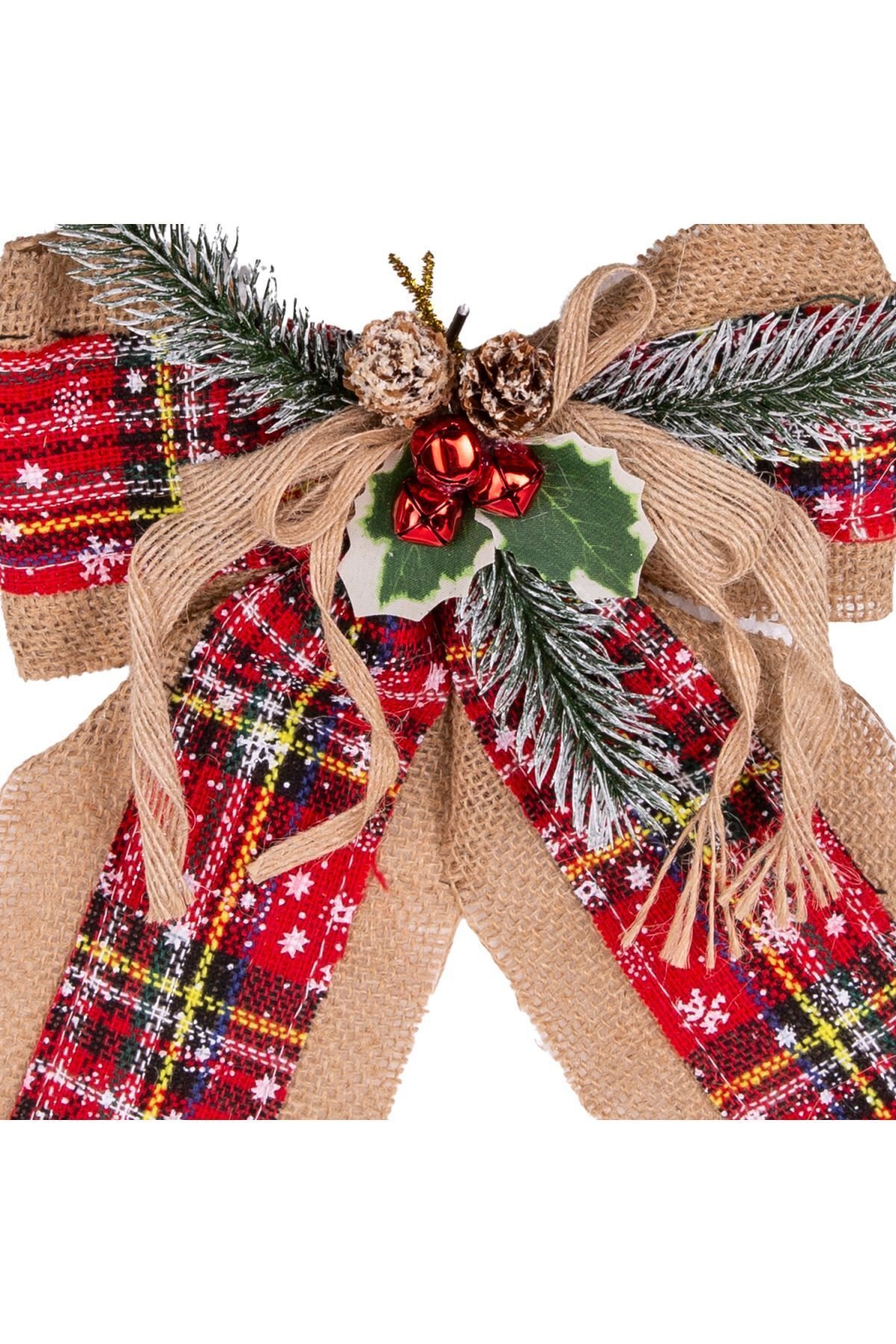 Yılbaşı Ağaç Süsü Yılbaşı Dekorlu Fiyonk Ekoseli Kırmızı 25x19 Cm