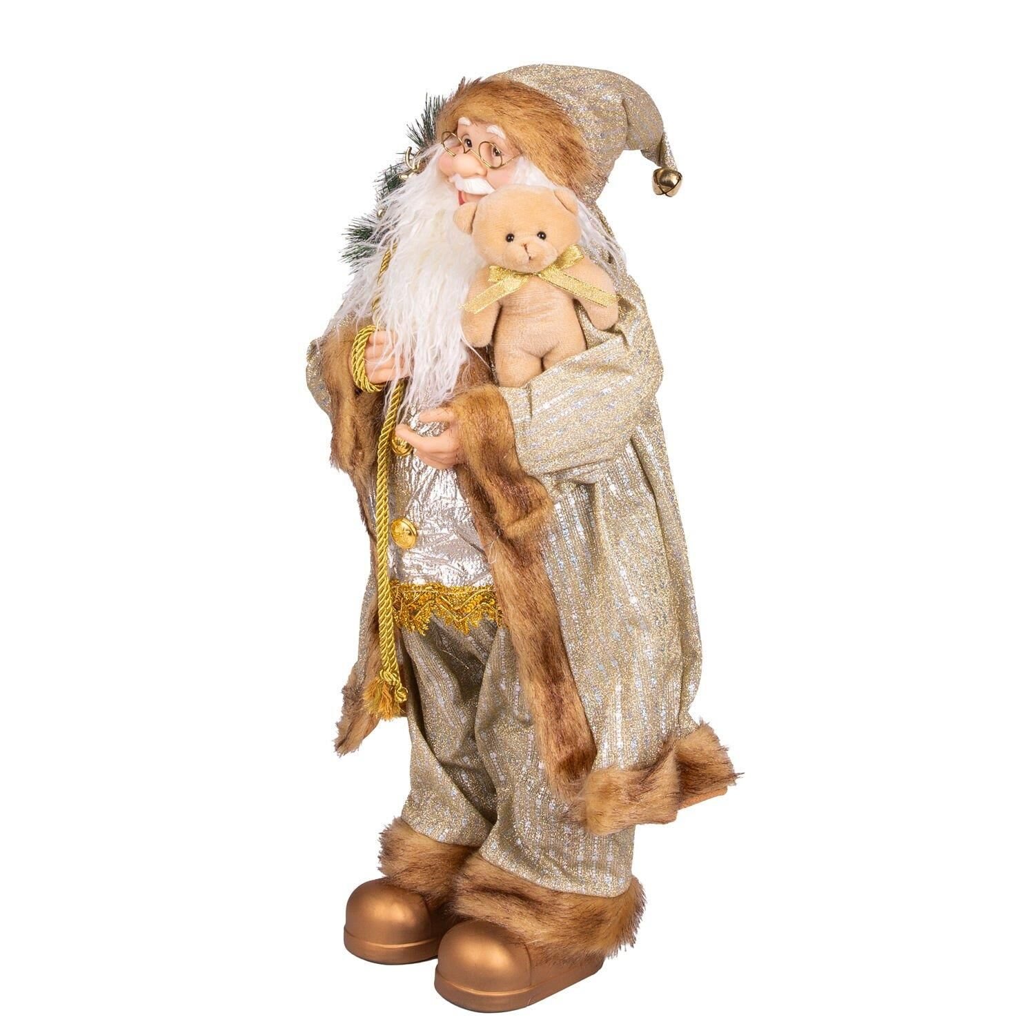 Yılbaşlarının olmazsa olmazı , sevimli görünümleriyle yılbaşı konseptinin tamamlayıcı unsurlarından olan içinde hediye paketi , çam kozalağı, çam dalları ve gold renkli geyik figürü dolu Yılbaşı Dekorlu torba , sol elinde tuttuğu Pelüş Ayı Dekorlu , kaliteli Gold parlak renkli giysisi ve şapkası, ayrıca şapkasında bulunan metal ses çıkaran çıngırak ayrıntısıyla noel baba figürü evlerinize neşe ve mutluluk getiriyor.