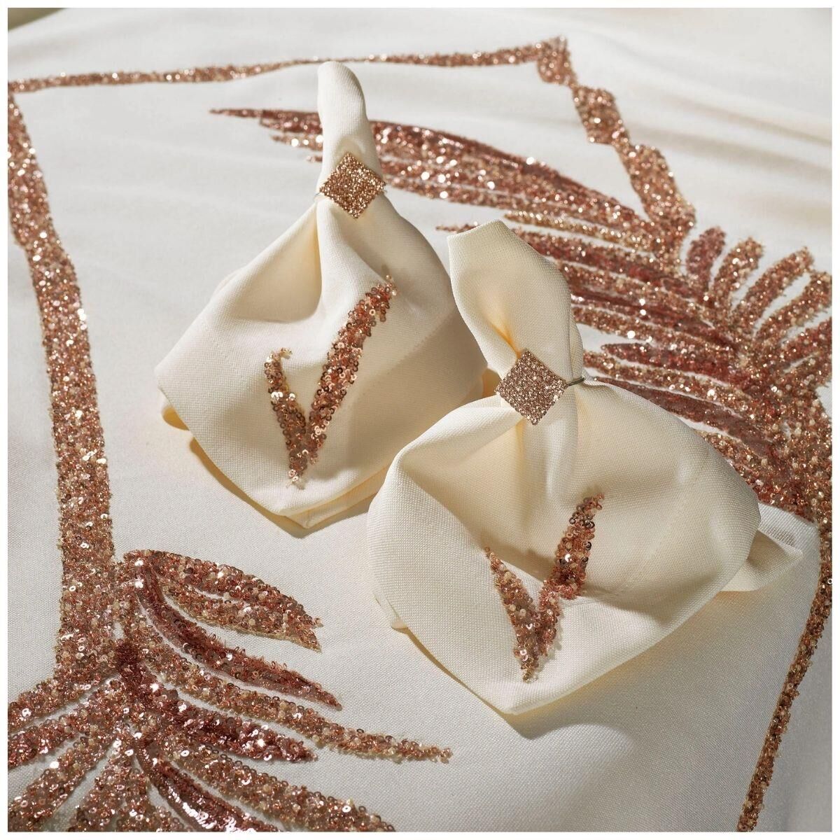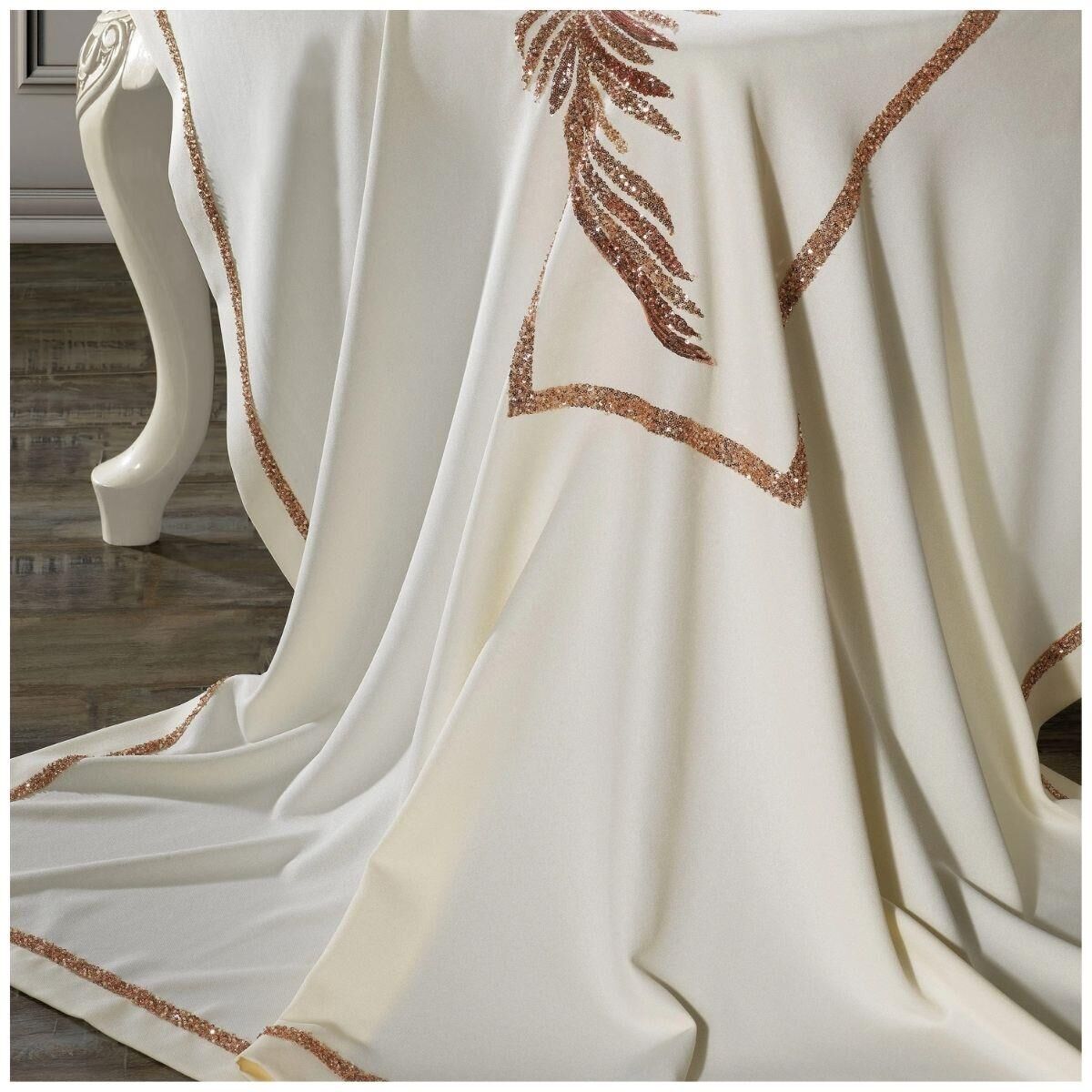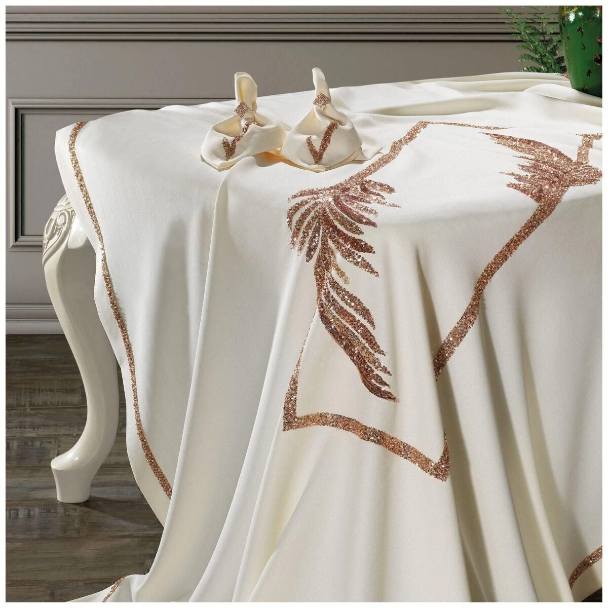 Işıltılı işlemeleri, masa örtüsüne lüks bir görünüm kazandırır.