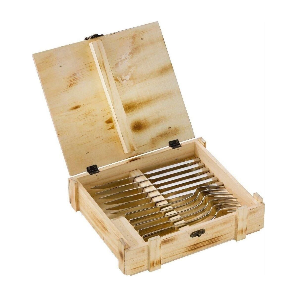 12 parçalı Set 6 kaliteli ZWILLING biftek bıçak ve 6 ZWILLING biftek çatal içerir. Biftek bıçaklarının tipik olan sivri uçlu bıçak şekli sayesinde bifteklerin kesilmesi kolaydır. Biftek çatal bıçak takımını saklamak için en uygun şekilde kullanılan rustik ahşap kutu ambalajı ile her yerde piknikte, bahçede mangal keyiflerinizde yanınızda taşıyın